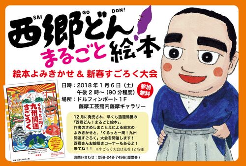 冬休みも残りわずかですね。 6日(土)ドルフィンポート1階の「薩摩工芸館」で、読みきかせ&すごろく大会をします。 実は、人前で「西郷どん!まるごと絵本」を読むのって初めて!あ〜緊張。 西郷どんのお絵描きコーナーも作ります。 「ぐるっと一周!九州…