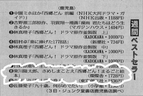 2018年1月7日の 南日本新聞読書欄、週間ベストセラーのコーナーで、 東川隆太郎&さめしまことえの『西郷どん! まるごと絵本』!!! めでたく8位にランクイン!!! よっ! 末広がり!! 隆太郎さん、やりました〜!!! こいつは春から縁起がええです。 上…